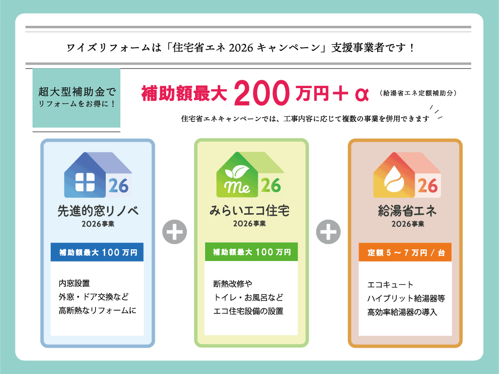 特に「先進的窓リノベ2026事業」「みらいエコ住宅2026事業」は、最大100万円の補助が受けられる可能性があります。